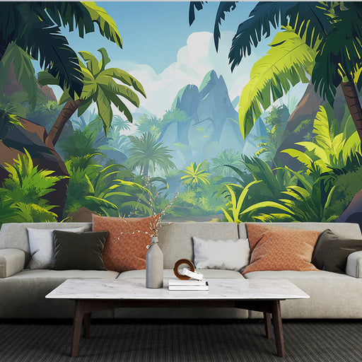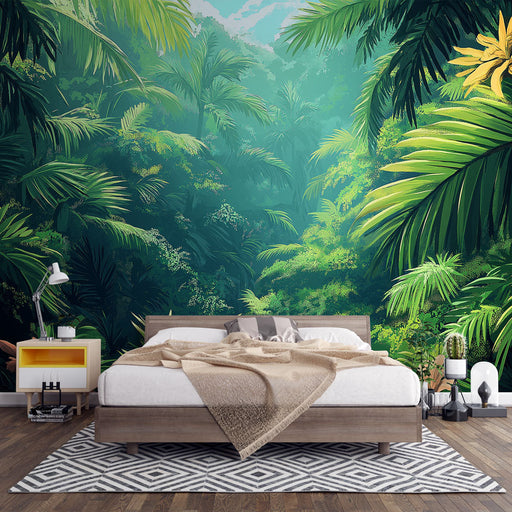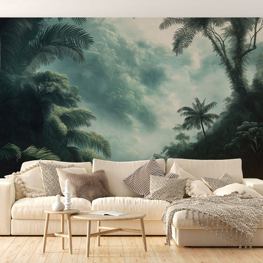 WonderMuralDette fototapetet fremkaller en levende tropisk jungel med nyanser av frodige grønne og tåkebelagte fjell. De realistiske detaljene i palmene og te...
