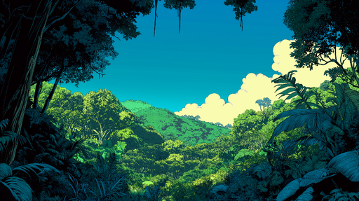 Vis fulle detaljerFototapet jungle | Frodig landskap med livlig vegetasjon og blå himmel
