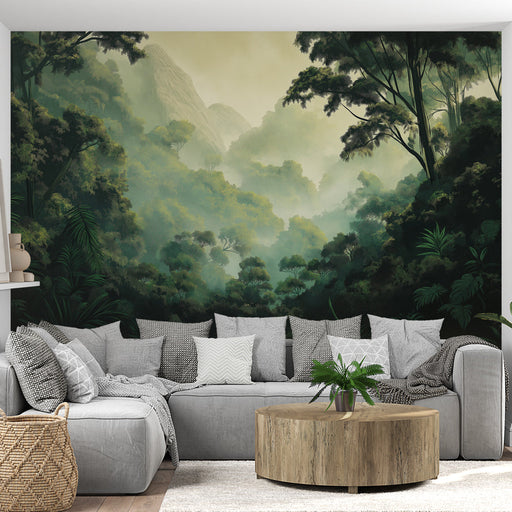 WonderMuralVår Mural Wallpaper vekker til live et frodig jungellandskap , og fanger essensen av vill natur med tåkete fjell og tett vegetasjon. De rike grønn...