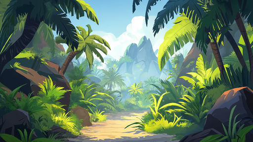 WonderMuralDette fengslende fototapetet viser et tropisk landskap, som illustrerer en svingete sti gjennom en frodig jungel, omgitt av majestetiske palmetrær ...