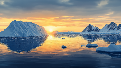 WonderMuralDette fototapetet fremkaller et slående arktisk landskap, der det gyldne lyset fra soloppgangen reflekteres på imponerende isfjell og rolige farvan...