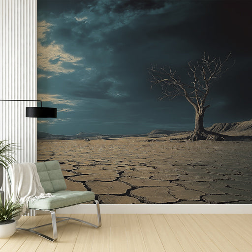 WonderMuralOppdag vår Fototapet med et karrig landskap der den sprukne jorden strekker seg så langt øyet kan se, og skaper en atmosfære av mystikk og ro. Et n...