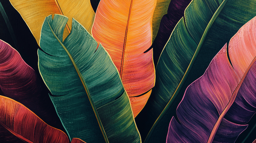 Vis fulle detaljerFototapet bananblad | Kunstnerisk stil fargerike blader på mørk bakgrunn