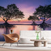 Vår fototapet fremkaller et landskap av majestetiske mangrover, som reflekteres i det glitrende vannet i skumringen. Silhuettene av trærne skiller seg ut mot en himmel farget med lilla og rosa nyanser, og skaper en rolig og fengslende atmosfære. Dette unike designet bringer et snev av eksotisme og ro til ethvert rom.