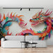 Dette spektakulære fototapetet avdekker en bevegelig drage, rikt dekorert med fargerike og dynamiske mønstre. Hver skjell er prydet med delikate detaljer i en levende palett som blander rosa, turkis, oransje, gul og lilla. Drages flammer og topper ser ut til å danse, og skaper et inntrykk av flyt og vitalitet. Denne komplekse og flerfargede designen er en sann feiring av kunst og legende.