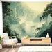 Denne fantastiske tapetmaleriet viser et praktfullt tropisk landskap innhyllet i tåke, og fremhever naturlige elementer som luksuriøse grønne planter og slanke palmetrær. Nyansene av grønt og gylne lysstråler skaper en luftig og rolig atmosfære, perfekt for å bringe en følelse av flukt til ethvert rom.