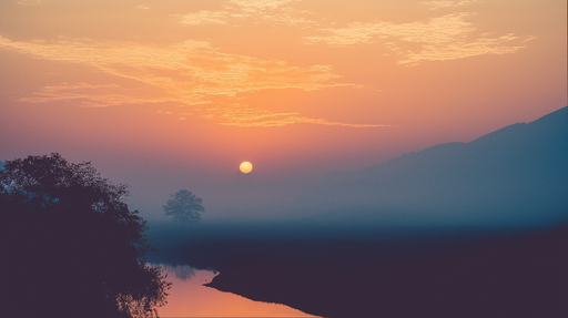 Wyświetl pełne szczegółyTapeta krajobrazowa oświetlenia | Mglisty wschód słońca z spokojnymi odbiciami