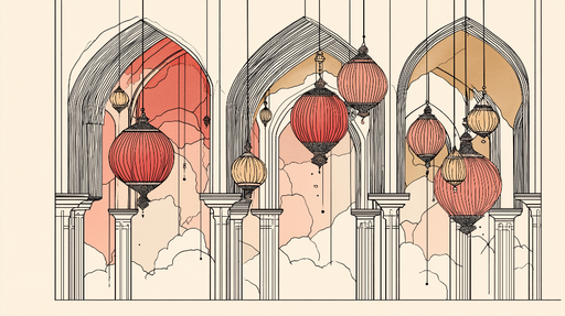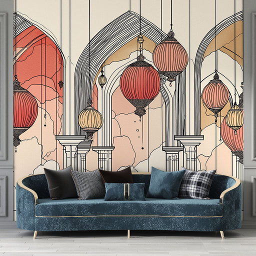 Wyświetl pełne szczegółyTapeta z latarniami wschodnimi | Eleganckie lampiony zawieszone w architektonicznych łukach