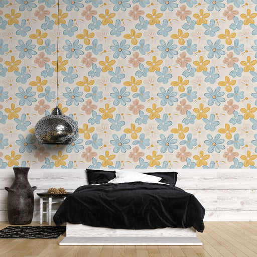 WonderMuralTa tapeta przedstawia uroczy motyw pastelowych kwiatów, łącząc odcienie niebieskiego, żółtego i różowego, tworząc radosną i wiosenną atmosferę w ka...