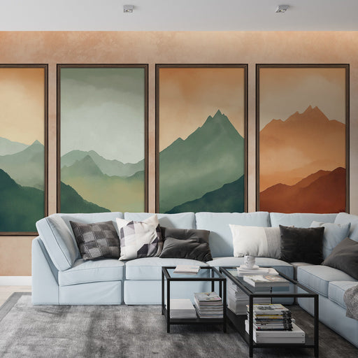WonderMuralTa tapeta przedstawia zbiór czterech obrazów przedstawiających górskie krajobrazy. Każdy obraz, z delikatnymi odcieniami zielonego, pomarańczowego ...