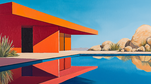 WonderMuralNasza tapeta ścienna prezentuje nowoczesny dom z odważnymi kształtami geometrycznymi, ubranymi w jaskrawe kolory takie jak czerwony i pomarańczowy....