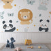 Ta tapeta ścienna to prawdziwa oda do dziecięcej radości, przedstawia delikatne ilustracje małych zwierząt, w tym lwa, pandę i małego niedźwiedzia. Wzory są podkreślone przez motyle i elementy kwiatowe, wszystko w miękkiej i kojącej palecie kolorów, tworząc zabawną i ciepłą atmosferę.