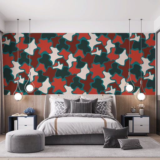 Studio SamaTa nowoczesna tapeta z kamuflażem przedstawia żywy abstrakcyjny wzór, który harmonijnie łączy czerwone, niebieskie i białe odcienie. Idealna do now...