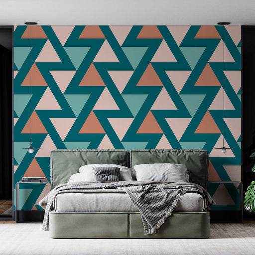 Studio SamaTa geometryczna tapeta przedstawia porywający wzór splecionych trójkątów w odcieniach turkusowego i koralowego. Doskonała dla tych, którzy chcą wni...
