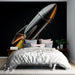 Ta śmiała i nowoczesna tapeta ścienna przedstawia metalową rakietę o futurystycznych liniach, oświetloną jasnym płomieniem w odcieniach żarzącego pomarańczu. Głębokie czarne tło podkreśla błyszczący wygląd rakiety i wzmacnia jej wyrafinowany i energetyczny urok.