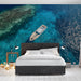 Ta tapeta ilustruje elegancką łódź unoszącą się na jasnych turkusowych wodach, oferując poczucie spokoju i ucieczki. Odcienie niebieskiego, od jasnego po głębokie, wywołują spokojne piękno tropikalnych mórz, idealne do wprowadzenia letniego akcentu do wnętrza.