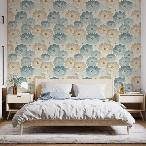 WonderMuralOdkryj naszą kwiatową tapetę ścienną z pięknym wzorem jasnoniebieskich i beżowych kwiatów na delikatnym tle. Delikatne kształty i subtelne detale k...