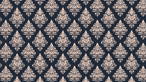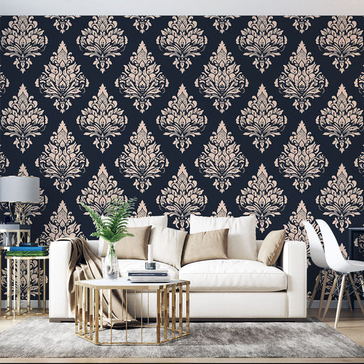 WonderMuralTa tapeta przedstawia elegancki wzór damasceński z stylizowanymi kwiatami, wzbogacony delikatnymi odcieniami różu na tle głębokiej, granatowej barw...