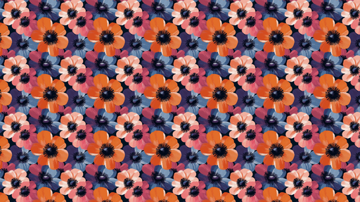 WonderMuralTa tapeta ścienna przedstawia ujmujący wzór kolorowych kwiatów, w tym maków i stokrotek, w żywych odcieniach pomarańczu, różu i fioletu. Ciemne tło...