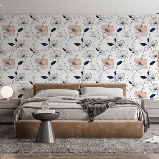 WonderMuralTa tapeta przedstawia uroczą wzór pastelowych kwiatów, łącząc delikatne brzoskwiniowe i kremowe odcienie na czystym białym tle. Delikatne linie i s...
