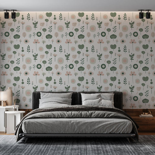 WonderMuralTa tapeta prezentuje uroczy wzór kwiatów i liści w delikatnych odcieniach zieleni i różu, tworząc kojącą i przyjemną atmosferę. Różnorodne ilustrac...
