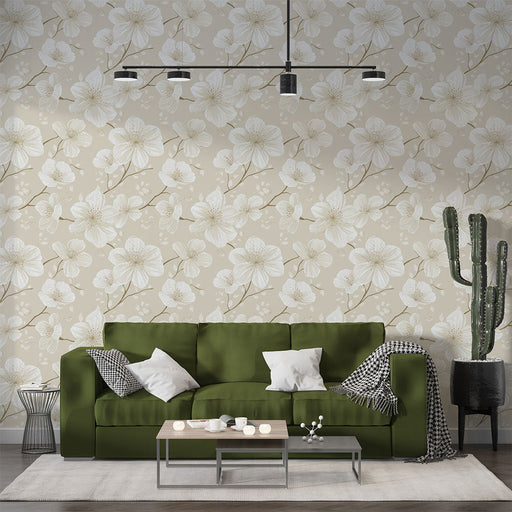 WonderMuralTa tapeta przedstawia delikatny wzór białych kwiatów kwitnących na miękkim beżowym tle, tworząc ciepłą i przytulną atmosferę. Wyrafinowane detale l...
