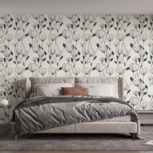 WonderMuralTa tapeta przedstawia piękny wzór stylizowanych kwiatów w odcieniach granatu, z ilustrowanymi wyrafinowanymi detalami. Kremowe tło podkreśla piękno...