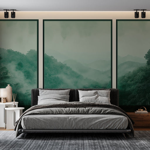 WonderMuralTa piękna tapeta przedstawia górski krajobraz spowity mgłą, z kojącymi zielonymi odcieniami, które wywołują atmosferę spokoju i natury. Subtelne de...