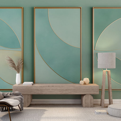 WonderMuralOdkryj naszą piękną tapetę ścienną naśladującą obraz, podkreślającą eleganckie organiczne kształty w odcieniach niebiesko-zielonych. Złote kontury ...