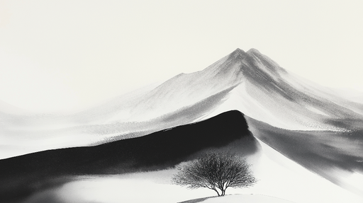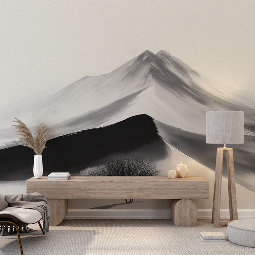 WonderMuralNasza Tapeta przedstawia minimalistyczny górski krajobraz w czerni i bieli, gdzie abstrakcyjne kształty gór delikatnie wyłaniają się, tworząc spoko...