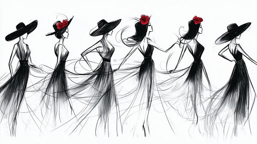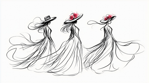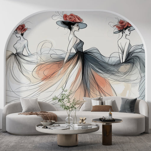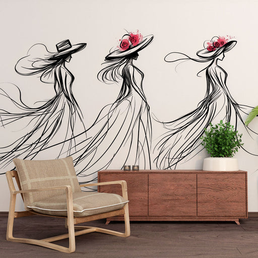 Art'loloTa Tapeta przedstawia eleganckie sylwetki kobiet w kapeluszach ozdobionych czerwonymi różami. Płynne czarne linie tworzą atmosferę ruchu i gracji, ...