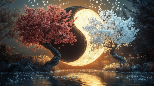 Art'loloOdkryj naszą Tapetę Yin Yang z majestatycznym pejzażem łączącym kwitnące drzewa wiśni i jasny symbol yin i yang. Ten artystyczny wzór uchwyci równo...