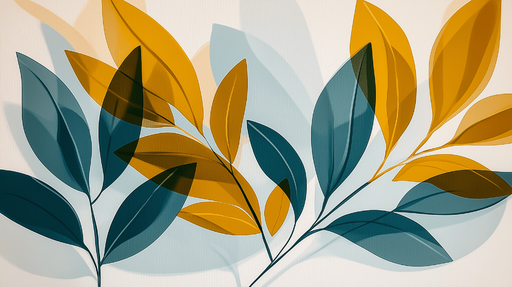 WonderMuralNowoczesne liście w odcieniach ochry i błękitu Ta tapeta ścienna przedstawia stylizowane liście w bogatych odcieniach, łącząc ciepłe ochry i kojące...