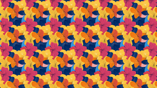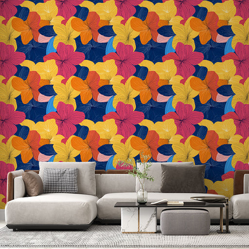 WonderMuralTa tapeta przedstawia luksusowy wzór kwiatowy w intensywnych kolorach, łącząc odcienie różu, żółci, pomarańczy i niebieskiego. Układ kwiatów, z del...