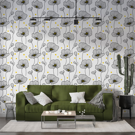 WonderMuralTa tapeta przedstawia uroczy wzór białych i żółtych kwiatów elegancko narysowanych na jasnym tle, które rozświetla przestrzeń. Delikatne linie i dr...