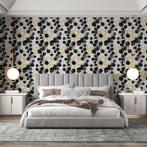 WonderMuralTa tapeta łączy elegancję czerni z świeżością żółtych akcentów, tworząc uderzający wzór liści i jagód. Ciemne odcienie dodają głębi, podczas gdy ja...