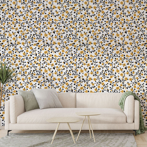 WonderMuralTa tapeta przedstawia uroczy wzór kwiatowy w żółtych i czarnych tonacjach, wyróżniający się na tle jasnobiałego tła. Delikatne kwiaty i sinuowane ł...
