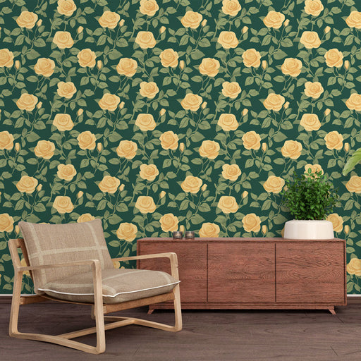 WonderMuralTa tapeta podkreśla piękny motyw żółtych róż w pełnym rozkwicie, otoczony bujną zielenią, wszystko na głębokim zielonym tle. Odcienie żółtego dodaj...