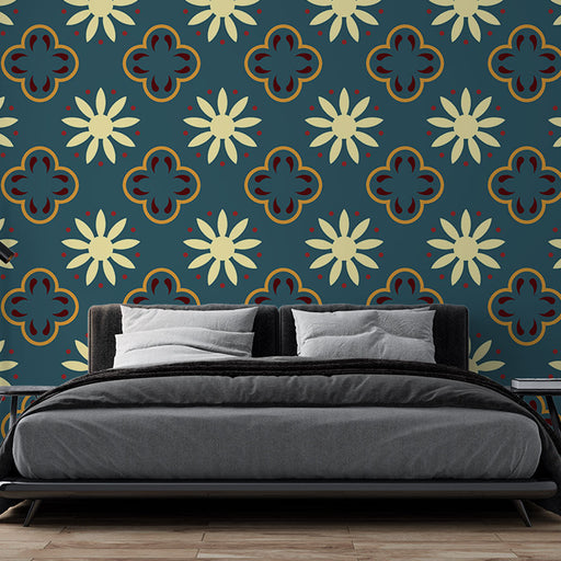 Wyświetl pełne szczegółyTapeta geometryczna z kwiatowym motywem | Wzory w stylu vintage w kolorze żółtym i niebieskim