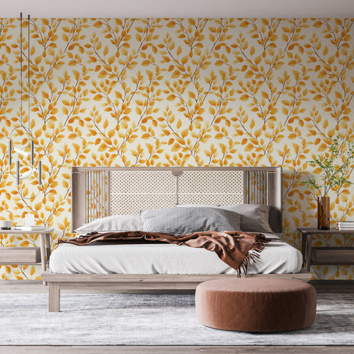 WonderMuralTa tapeta ścienna przedstawia elegancki wzór liści miłorzębu, delikatnie zilustrowany odcieniami żółtego, zmieniającymi się od złotego do bursztyno...