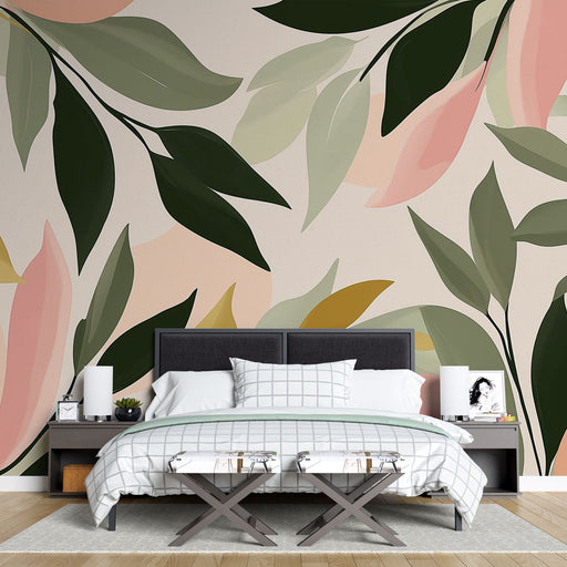 WonderMuralTa tapeta ścienna przedstawia duże liście w delikatnych i kojących odcieniach, takich jak ciemna zieleń, pudrowy róż i ochrowy żółty. Układ liści d...