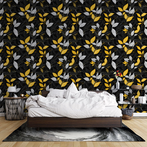 WonderMuralTa unikalna tapeta przedstawia oczarowujący wzór żółtych i białych liści delikatnie ułożonych na głębokim czarnym tle. Połączenie kolorów tworzy dy...