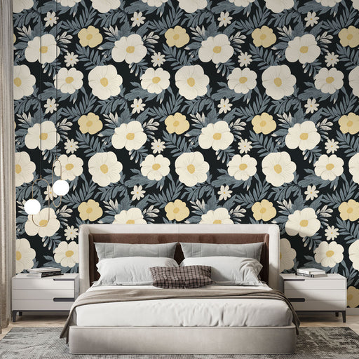 Wyświetl pełne szczegółyTapeta ścienna z motywem kwiatowym | Białe i żółte kwiaty na ciemnym tle