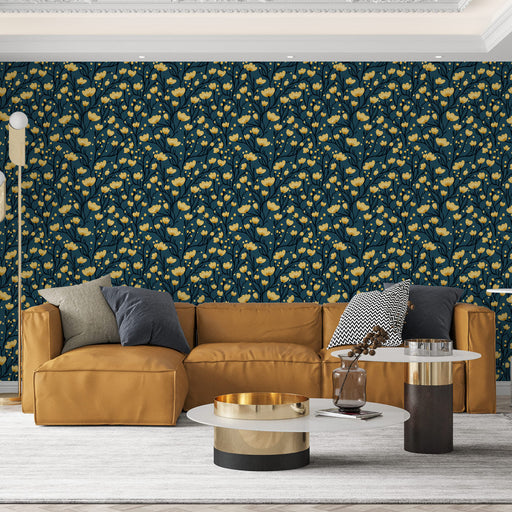 Wyświetl pełne szczegółyTapeta z motywem kwiatowym w kolorze żółtym na granatowym tle | Złote wzory kwiatów na ciemnym tle