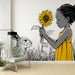 Nasza doskonała tapeta ścienna przedstawia żywą scenę, w której mała dziewczynka ofiaruje słonecznik ciekawemu królikowi, otoczona pięknymi kwiatami. Jasne kolory i kapryśny styl tworzą ciepłą i pełną wyobraźni atmosferę, idealną do dziecięcej sypialni lub przestrzeni poświęconej kreatywności.