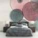 Ta fototapeta prezentuje nowoczesny design z różnokolorowymi kołami, począwszy od delikatnego różu do pastelowego zieleni, podkreślonych czarnymi graficznymi liniami. Połączenie kształtów geometrycznych i delikatnych cieni tworzy atmosferę, która jest zarówno elegancka, jak i energetyczna. Jasne tło pozwala wzorom się wyróżniać, jednocześnie oferując lekkość wizualną.