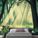 Ta tapeta ścienna przywołuje zaczarowany las, gdzie promienie światła przenikają przez gęste liście, tworząc kojącą i magiczną atmosferę. Odcienie zieleni, połączone z nutami złotego światła, przynoszą uczucie spokoju i kontaktu z naturą.