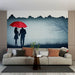 Ulepsz swoje wnętrze za pomocą tej romantycznej tapety przedstawiającej dwie sylwetki pod czerwonym parasolem w deszczu. Ten projekt wywołuje poetycką i intymną atmosferę, idealną do wprowadzenia odrobiny miłości i tajemnicy do salonu lub sypialni.