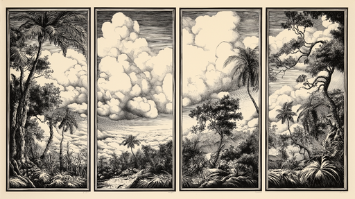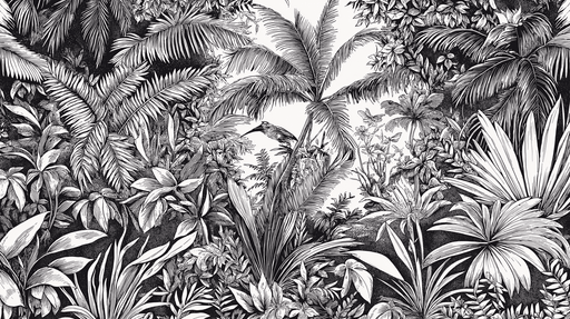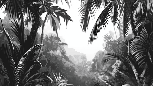 The black and white jungle wallpaper with palm trees, foliage, and birds invites you to immerse yourself in an exotic and elegant ambiance. Inspired by the lushness of the tropical jungle, this captivating jungle wallpaper features majestic palm trees, lush foliage, and exotic birds, all in monochrome tones that add a touch of sophistication to your space.