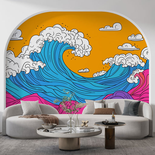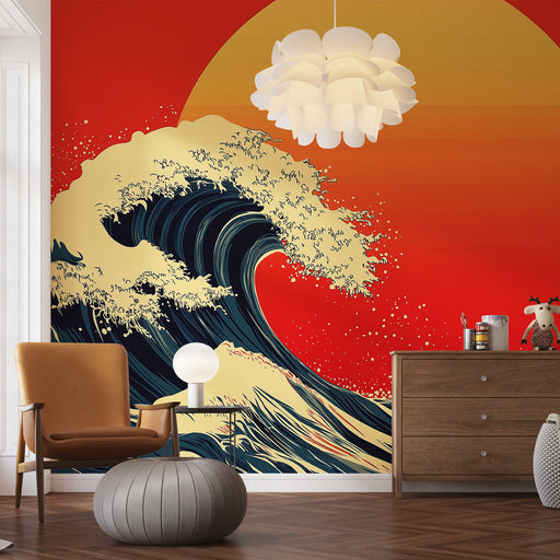 Japanese Wave Mural Wallpaper | Red Sun Background with White Clouds